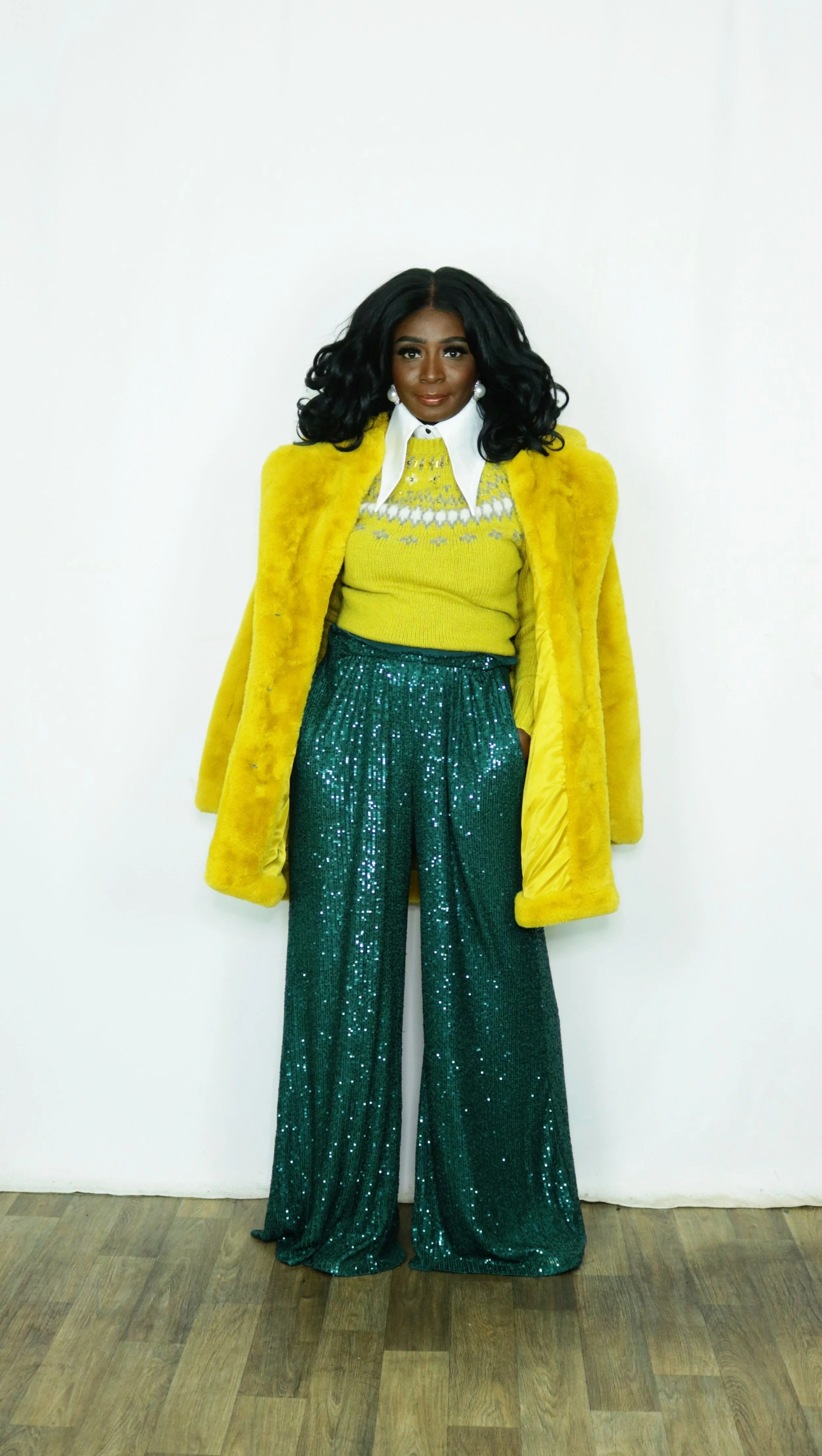 :Sequins Pants Styled Two Ways: Pants : Here Sweater : Jcrew (old) Similar Coat : Apparis Similar Collar : Here Pants : Here Top : Here Coat : Apparis Simillar Similar Coats, PantsPRIS BBNovember 27, 2022Green Sequins Pants, sequins pant, Wide Leg Pants, faux fur coat, Green Faux Fur Coat, Yellow Faux Fur Coat, Color Green, Color Yellow, Fair Isle Sweater, Yellow Sweater 0 Likes